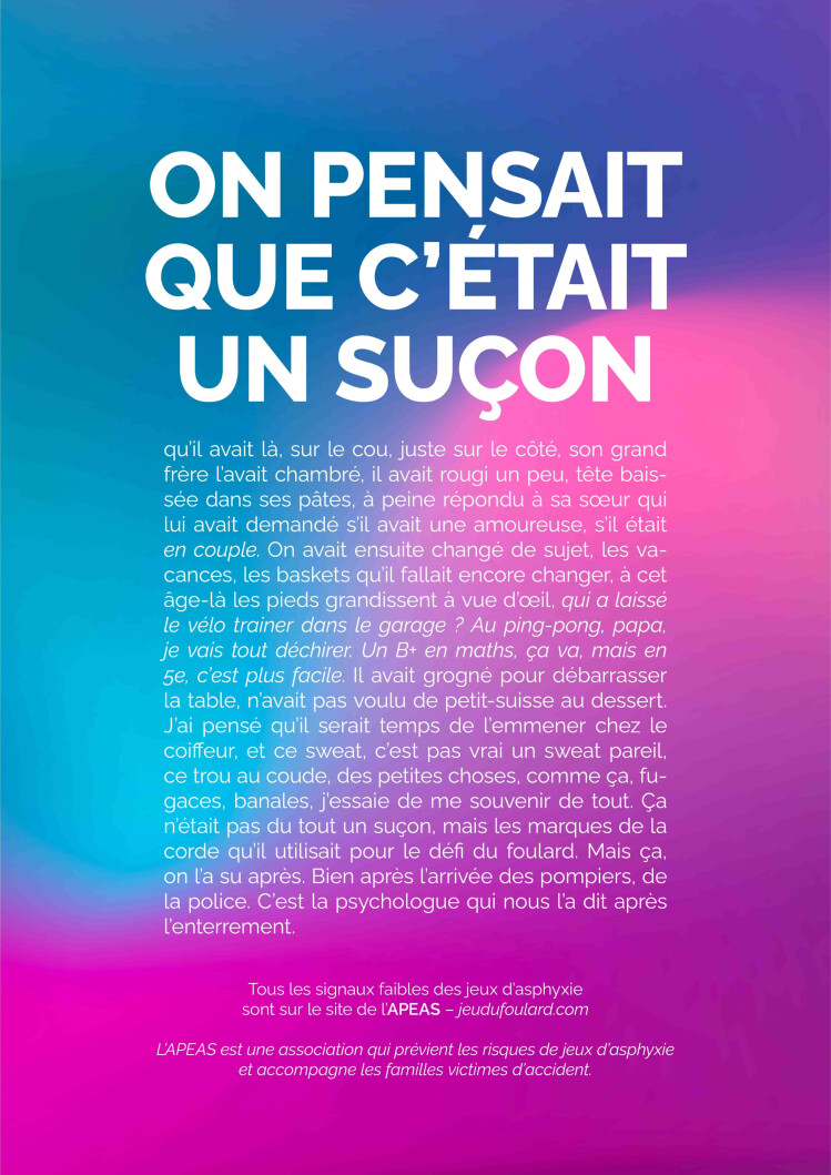 Depuis 2002 l’Apeas alerte les pouvoirs publics et fait de la prévention en milieu scolaire. Cette campagne 2022 a pour but de rendre publics les différents signaux faibles qui peuvent alerter les parents et ouvrir la discussion. Selon Françoise Cochet, présidente de l’Apeas, « la difficulté était à la fois d’alerter les parents sans bien sûr éveiller la curiosité des plus jeunes et les pousser à essayer ces pratiques. Nous avons choisi cette campagne, qui utilise les mots, plus difficile à comprendre pour les plus jeunes ». Les victimes de « jeux » d’asphyxie ont en général entre 7 et 12 ans.
