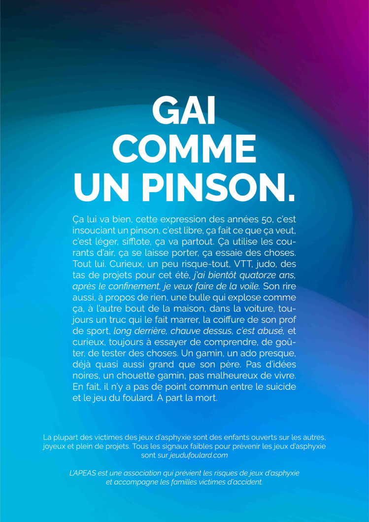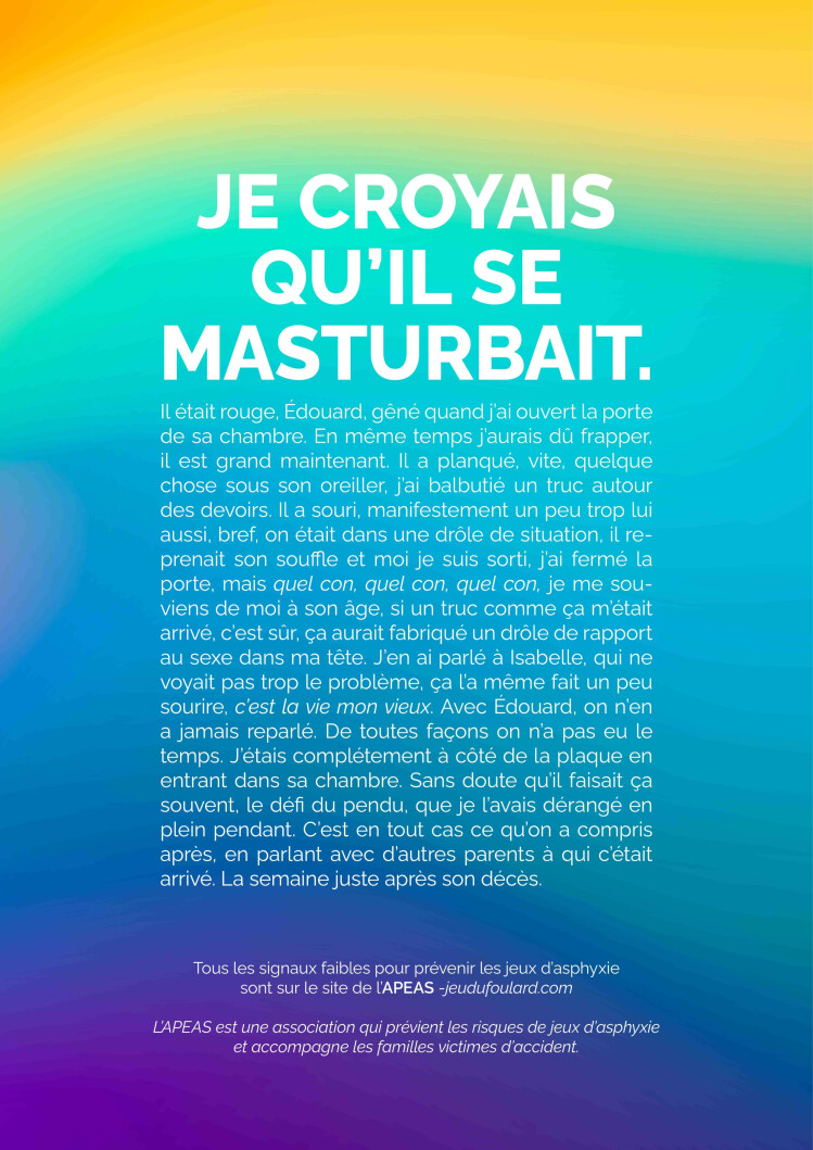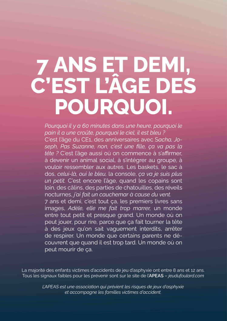 Depuis 2002 l’Apeas alerte les pouvoirs publics et fait de la prévention en milieu scolaire. Cette campagne 2022 a pour but de rendre publics les différents signaux faibles qui peuvent alerter les parents et ouvrir la discussion. Selon Françoise Cochet, présidente de l’Apeas, « la difficulté était à la fois d’alerter les parents sans bien sûr éveiller la curiosité des plus jeunes et les pousser à essayer ces pratiques. Nous avons choisi cette campagne, qui utilise les mots, plus difficile à comprendre pour les plus jeunes ». Les victimes de « jeux » d’asphyxie ont en général entre 7 et 12 ans.